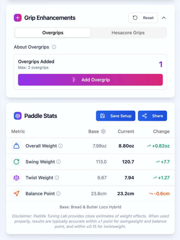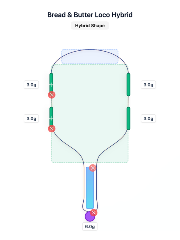 Hybrid paddles usually start with a naturally balanced feel and a mid to good sweet spot. The goal here isn’t to necessarily fix anything. It’s to enhance it by expanding the sweet spot while keeping that stock balance and plow-through intact.